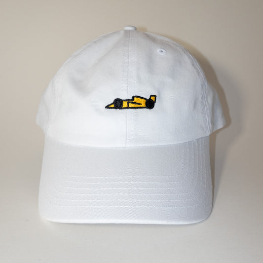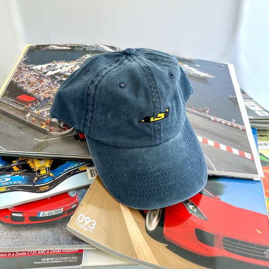 Yellow racecar on washed blue hat