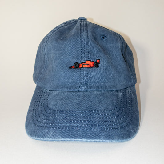 Red race car logo on washed blue hat